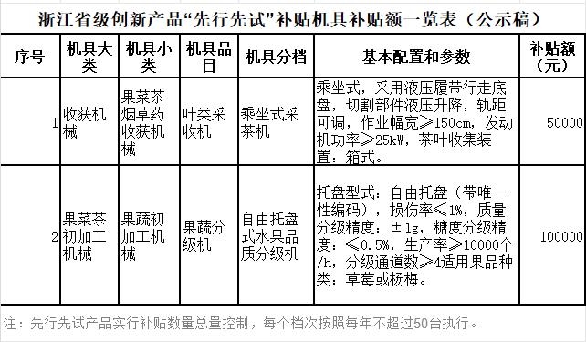 浙江省省級(jí)創(chuàng)新產(chǎn)品“先行先試”補(bǔ)貼機(jī)具補(bǔ)貼額一覽表公示