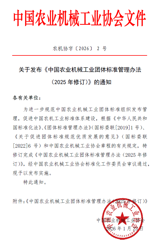 關(guān)于發(fā)布《中國農(nóng)業(yè)機(jī)械工業(yè)團(tuán)體標(biāo)準(zhǔn)管理辦法(2025年修訂)》的通知