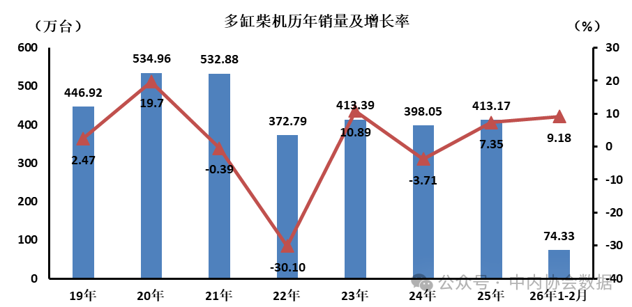 2026年2月多缸柴油內(nèi)燃機(jī)銷售31.74萬臺(tái),同比增長(zhǎng)-7.30%