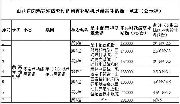 山西省肉雞養(yǎng)殖成套設(shè)備購置補(bǔ)貼機(jī)具最高補(bǔ)貼額一覽表公示